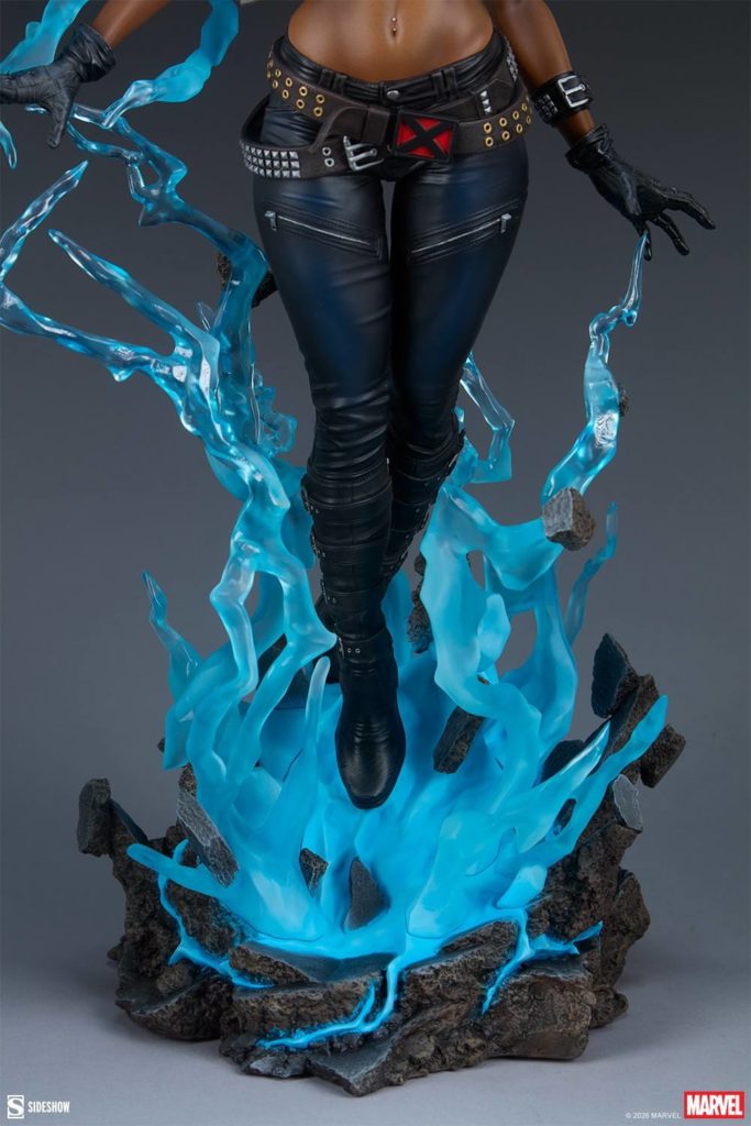 La statua raffigura Ororo Munroe mentre evoca un vortice con i suoi poteri di manipolazione del tempo.